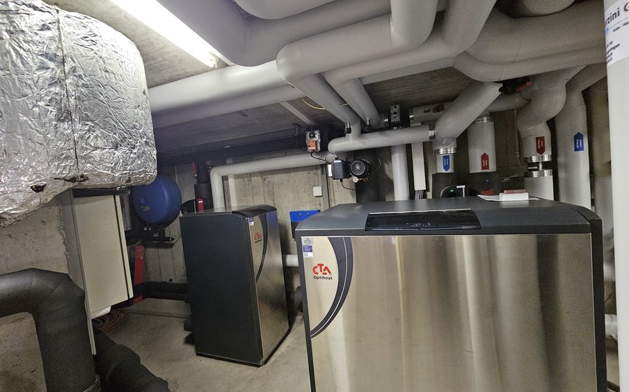 Seit dem Herbst 2025 wird die Siedlung nun von zwei Wärmepumpen der Schweizer Firma CTA beheizt. Durch die parallele Verschaltung kann gleichzeitig Heizwasser und Brauchwarmwasser hergestellt werden. Somit muss an kalten Tagen der Heizbetrieb nie für die Warmwasseraufbereitung unterbrochen werden, was einen hohen Wohnkomfort ermöglicht. Entscheidend erhöht sich der Komfort nun auch im Sommer, da das Gebäude über die Fussbodenheizung passiv gekühlt werden kann. Die entzogene Wärme wird dabei über die Erdsonden in den Boden eingespeist, was wiederum die Effizienz der Heizung im Winter erhöht.