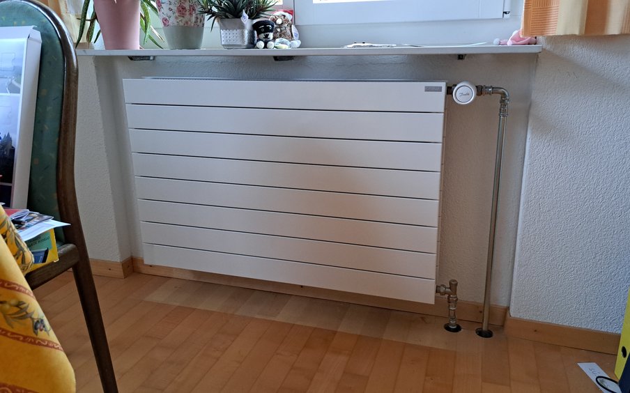 Da im Gebäude zuvor keine wassergeführte Heizung vorhanden war, realisierte Hauser & Schwerzmann Haustechnik AG die komplette Wärmeverteilung neu. Sämtliche Leitungen wurden fachgerecht installiert und die Wärmeabgabe optimal auf das Gebäude abgestimmt. Die Kombination aus modernen Radiatoren und einer effizienten Fussbodenheizung, aufgeteilt in zwei sauber abgeglichene Heizgruppen, sorgt heute für eine gleichmässige und behagliche Wärme in allen Wohnbereichen. Die neue Wärmeabgabe wurde zudem mit einem namhaften Förderbeitrag des Kantons unterstützt.