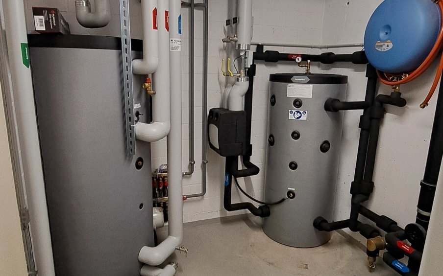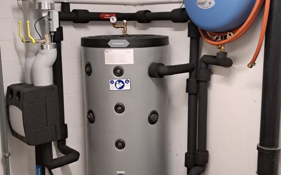 Zusätzlich installierten wir einen neuen Pufferspeicher und passten die hydraulische Einbindung der Wärmepumpe an die bestehende Heizverteilung an. Durch die sorgfältige Planung konnte die Anlage platzsparend in den bestehenden Heizungsraum integriert werden.